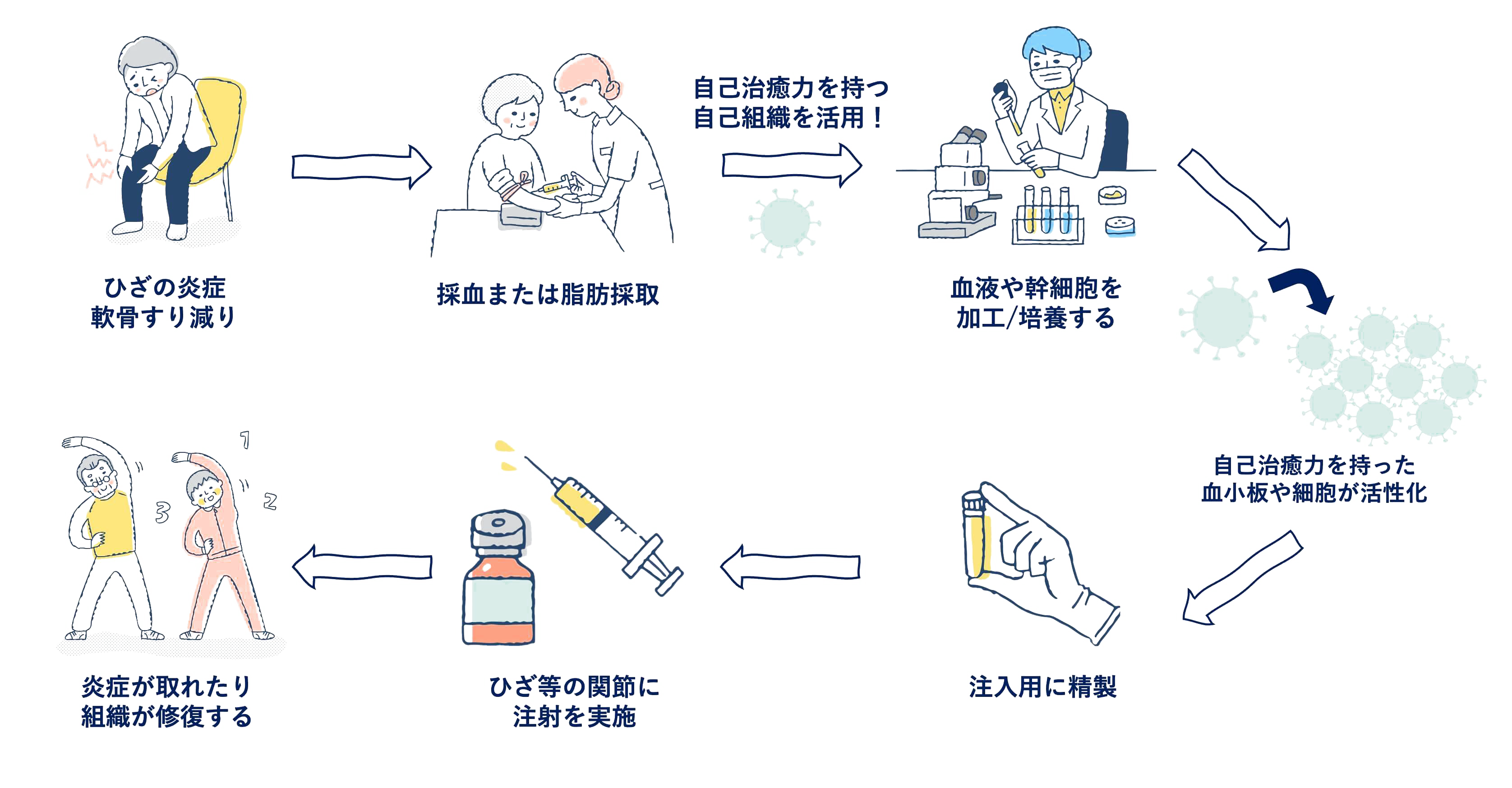 再生医療とは、このような人間が本来持つ「自己治癒力」を活用し、ひざ等を治療する最先端の医療です。